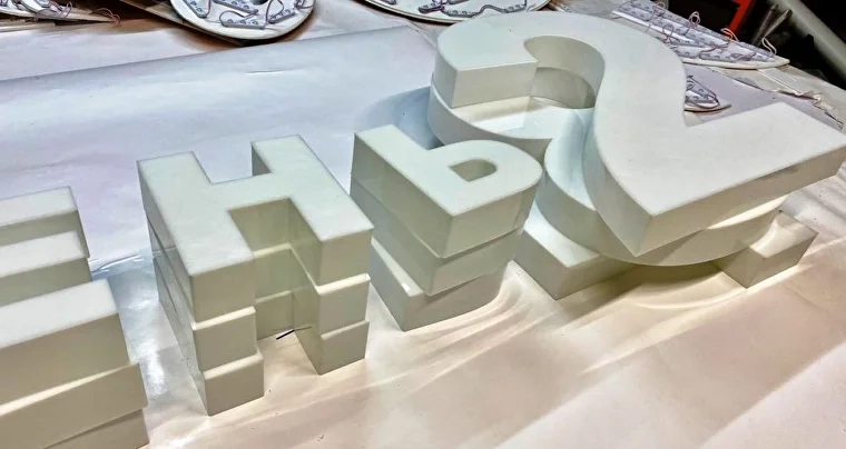 Самый подходящий материал для наружной вывески — поливинилхлоридный лист. Он представляет собой вспененный ПВХ с ровной и твердой поверхностью. Благодаря такой структуре листы ПВХ получаются легкими, их просто резать и скреплять, вес рекламной конструкции также будет небольшим. Кроме того, поливинилхлорид устойчивый к атмосферным воздействиям, медленно выгорает под ультрафиолетом и ему можно придать небольшой радиус для изготовления конструкций сложной формы.